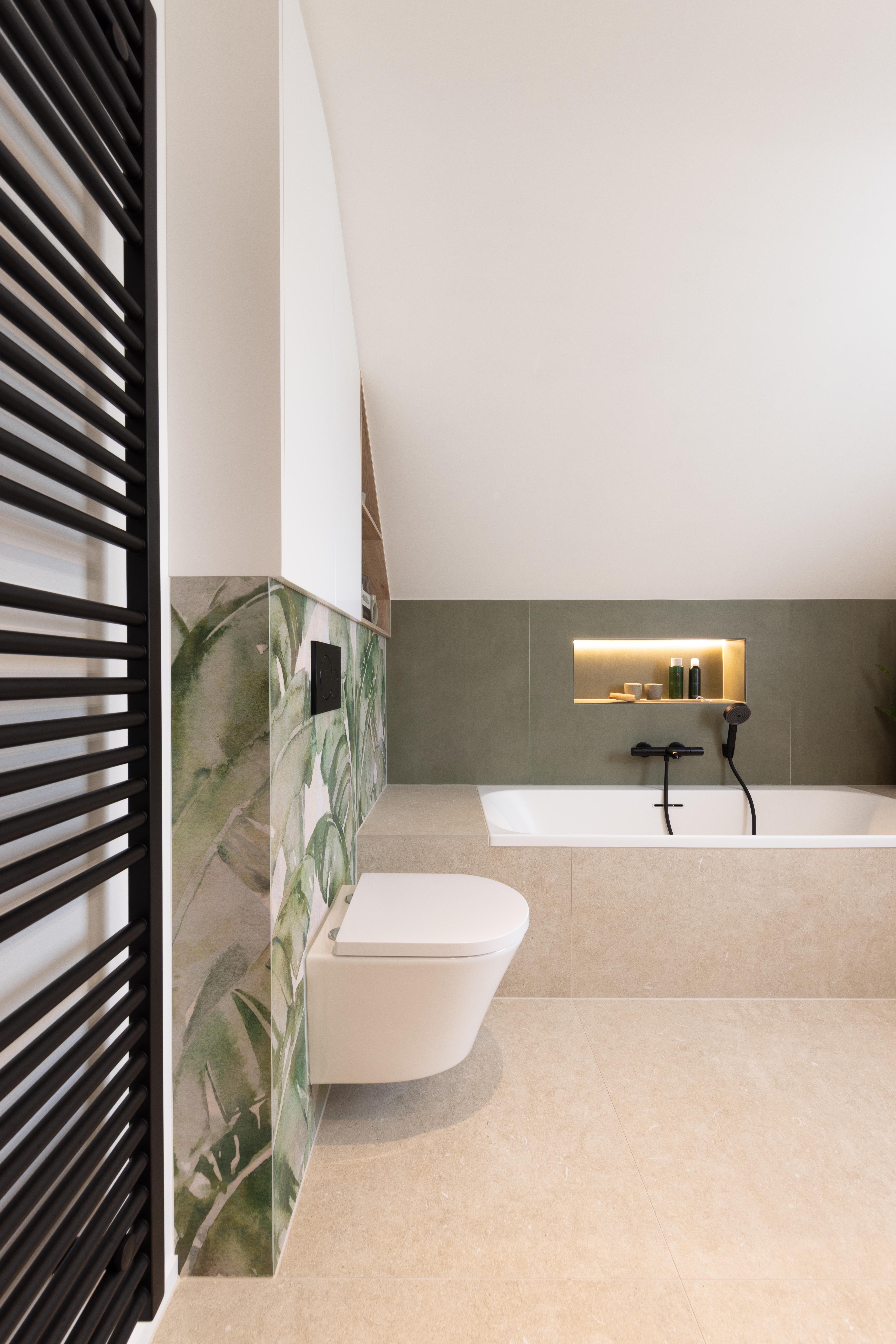 Projet ou l'utilisation d'un grand format de carrelage décor donne une touche unique à cette salle de bains. La pente de toit perd de son importance et l'équilibre meuble/mur déco est juste parfait !