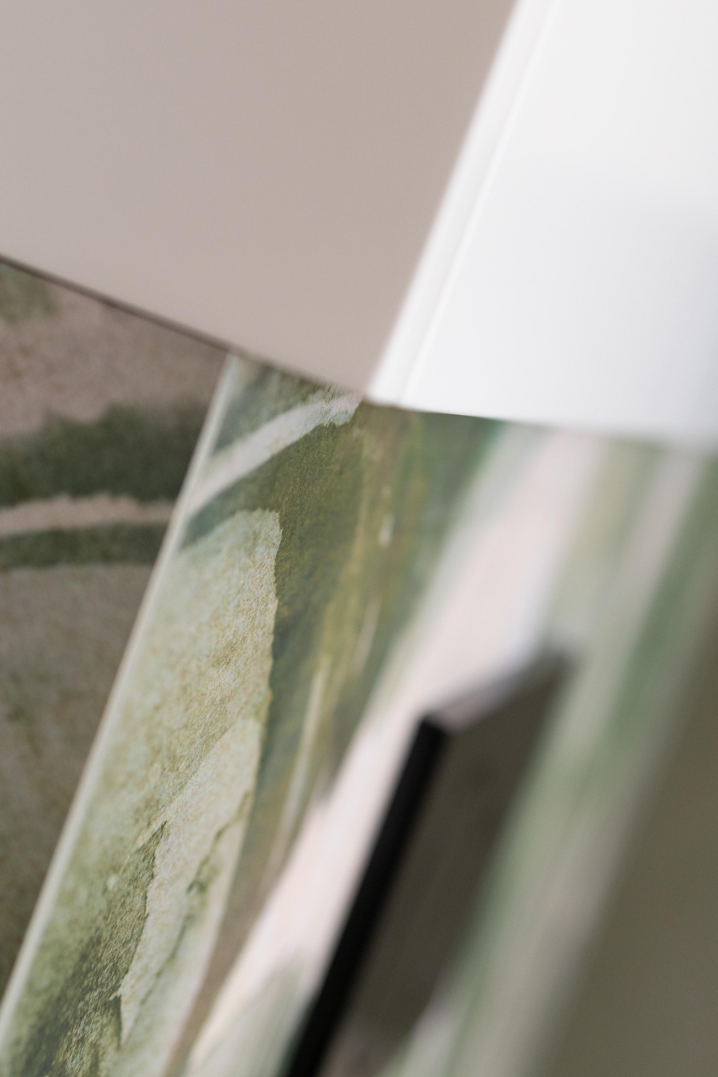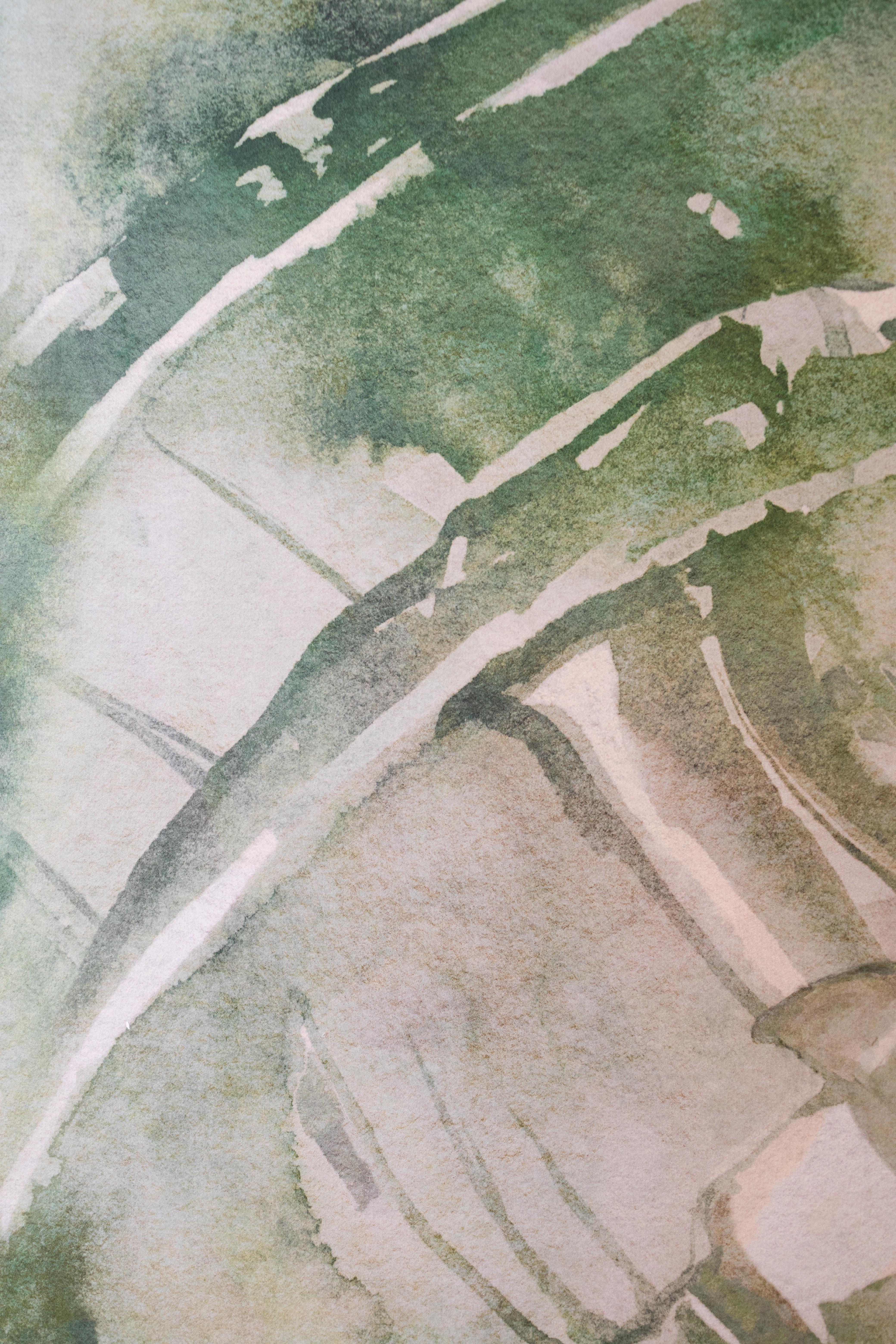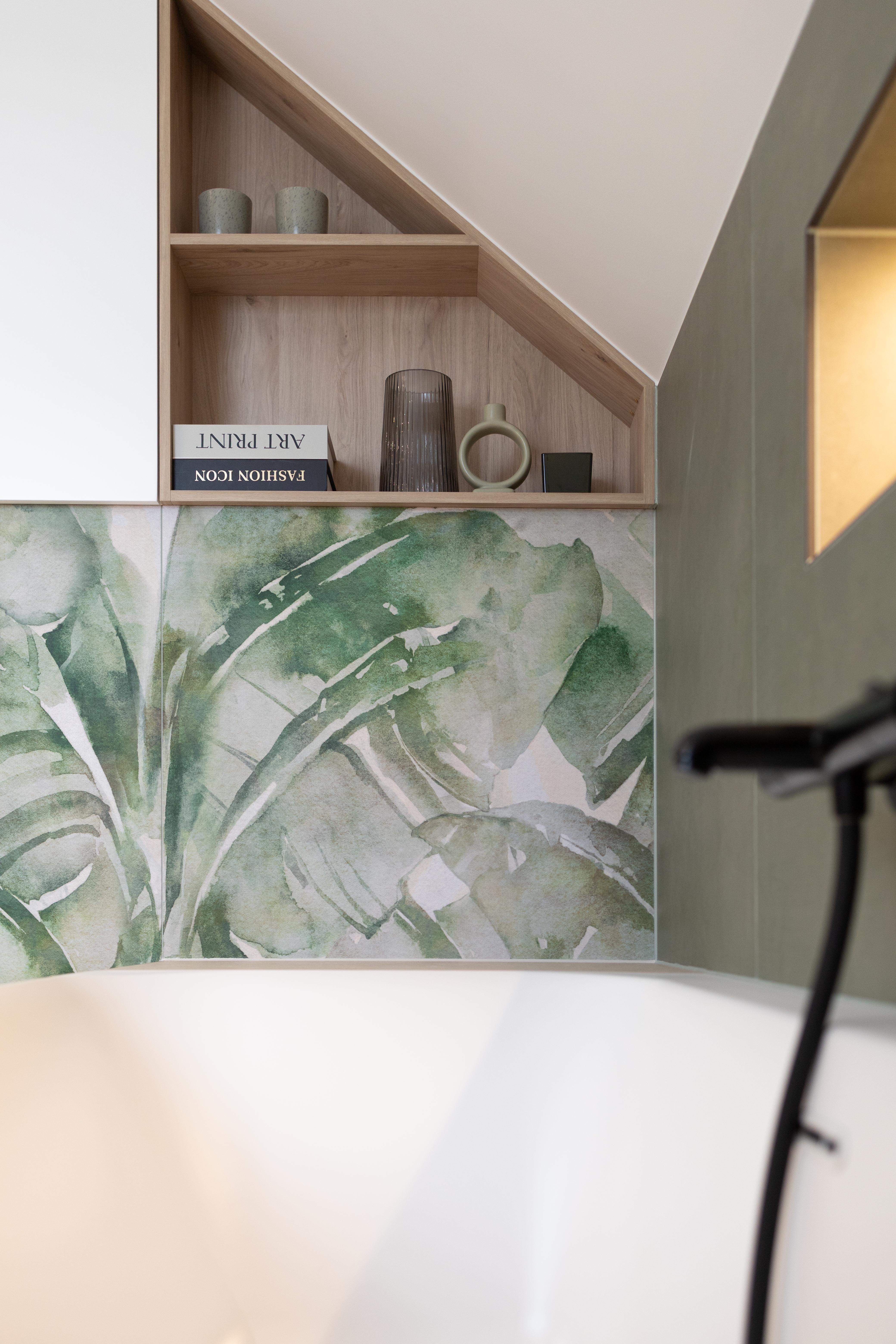 Petite salle de bains où le revêtement mural graphique et chaleureux "aux tonalités florales" s'associe joliment à la couleur eucalyptus du meuble. Une symphonie de nuances de vert dans un équilibre parfait !