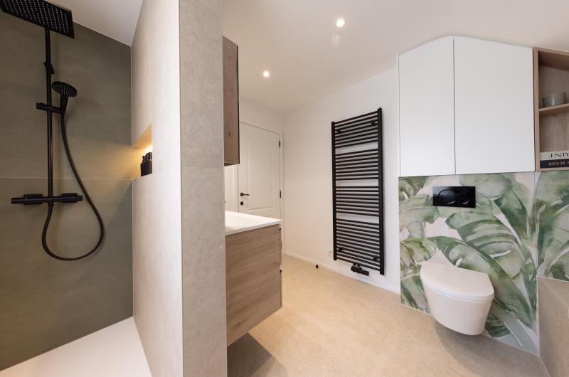 Projet combinant un bain, une grande douche et un coin intime pour l'espace wc. Le tout mis en relief par le coloris du meuble et des grands carrelages. Les plus petits carreaux aux dessins géométriques donnent un équilibre moderne à cette salle de bains.